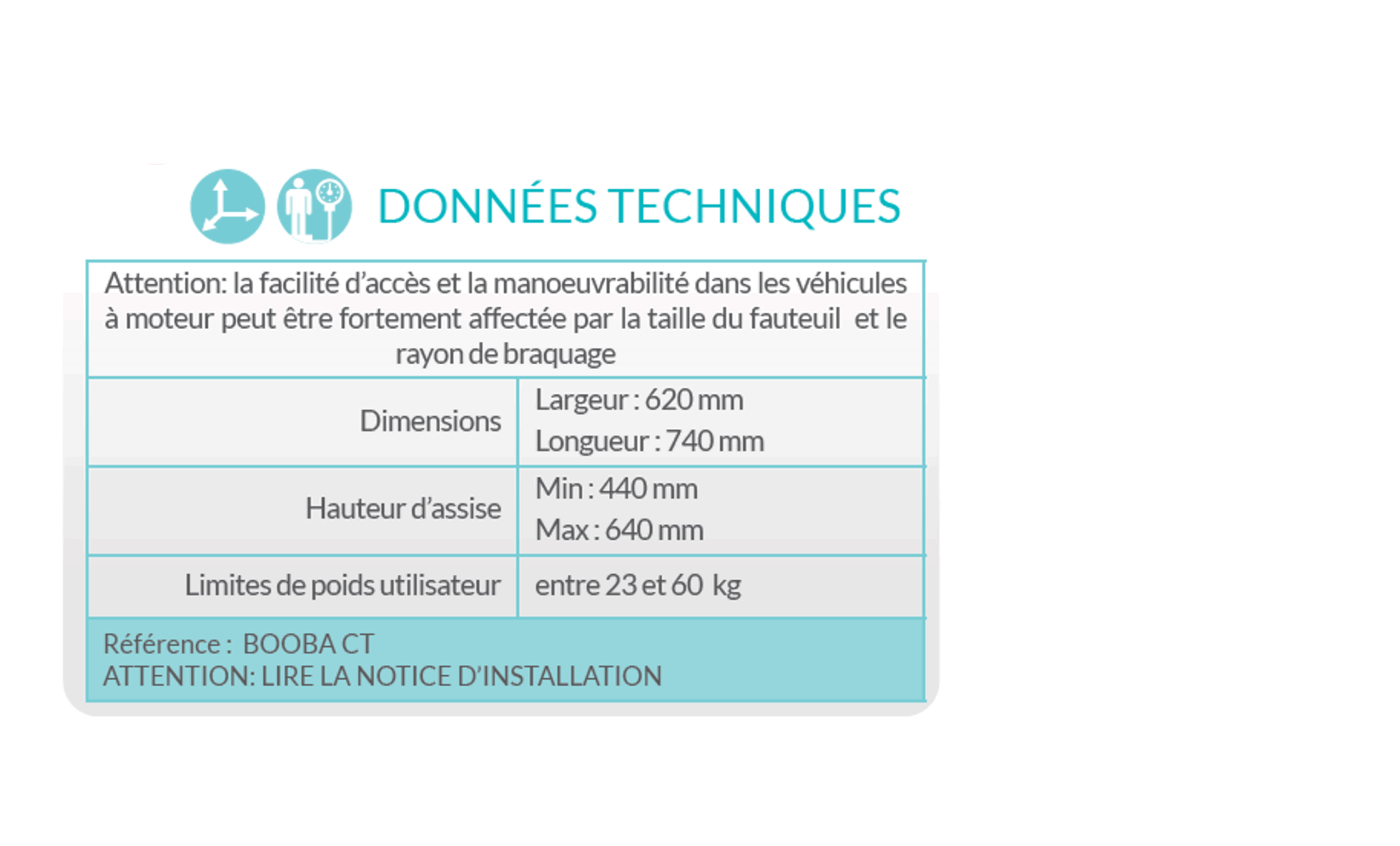 Conforme aux exigences de l’ISO 7176-19:2022, le BOOBA CT peut être fixé face à la route lorsqu’il est utilisé comme siège dans un véhicule à moteur.