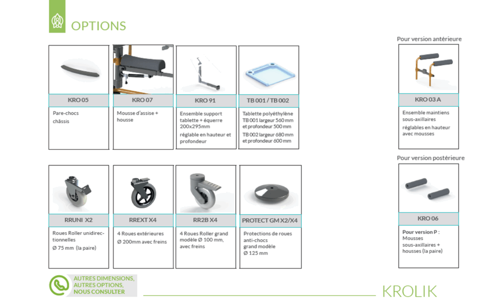 Le KROLIK est un cadre de marche qui permet de recevoir des corset-selles sur mesure. Il existe en version antérieure ou postérieure. Il dispose de nombreuses possibilités de fixations de selles afin d’offrir un système personnalisé en fonction de l’enfant et de ses besoins. L’inclinaison d’assise ainsi que le dossier amovible permet une installation sans obstacles du patient sur la selle.