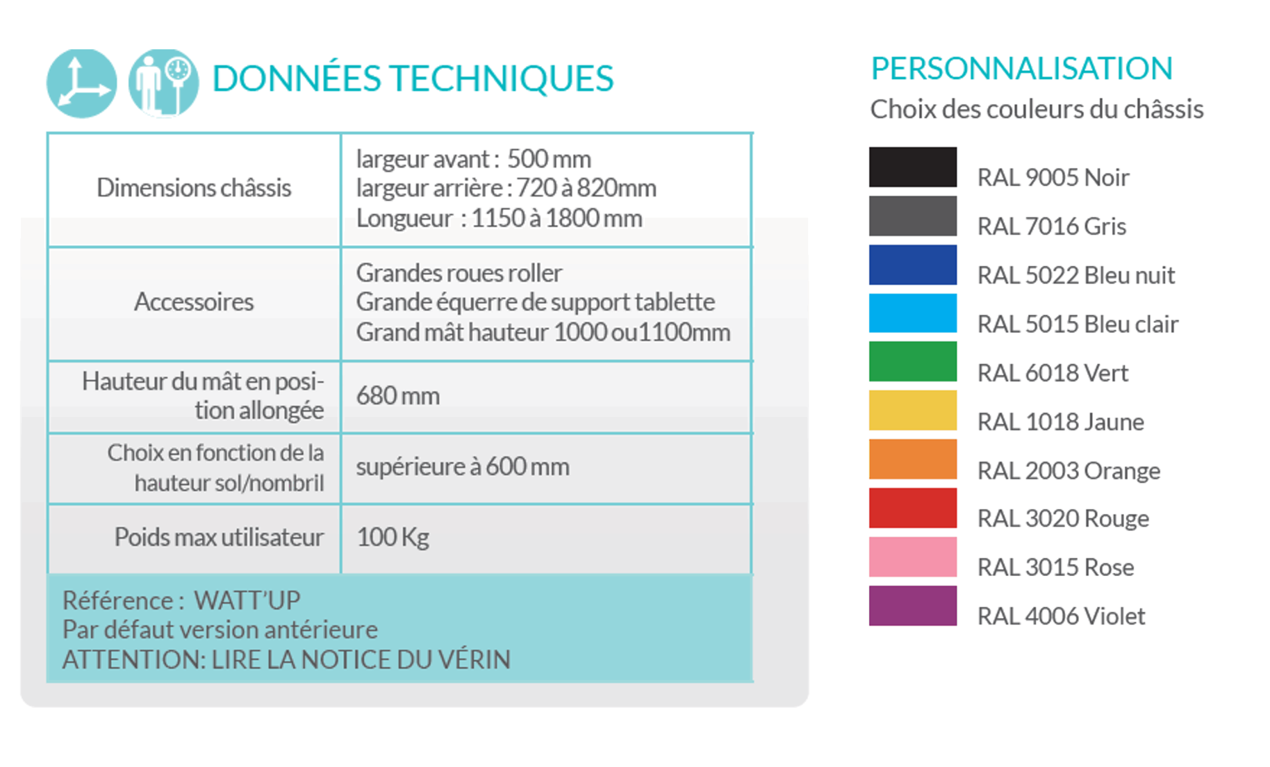 Avec le WATT’UP , le passage de la position verticale à la position horizontale est facilitée par l’assistance vérin électrique. Ce système dispose de toutes les possibilités de fixation avec des pièces redimensionnées pour accueillir les coques de grandes tailles. Le WATT’UP peut recevoir une coque ventrale ou dorsale. L’empattement du châssis est réglable pour offrir une meilleure stabilité.
